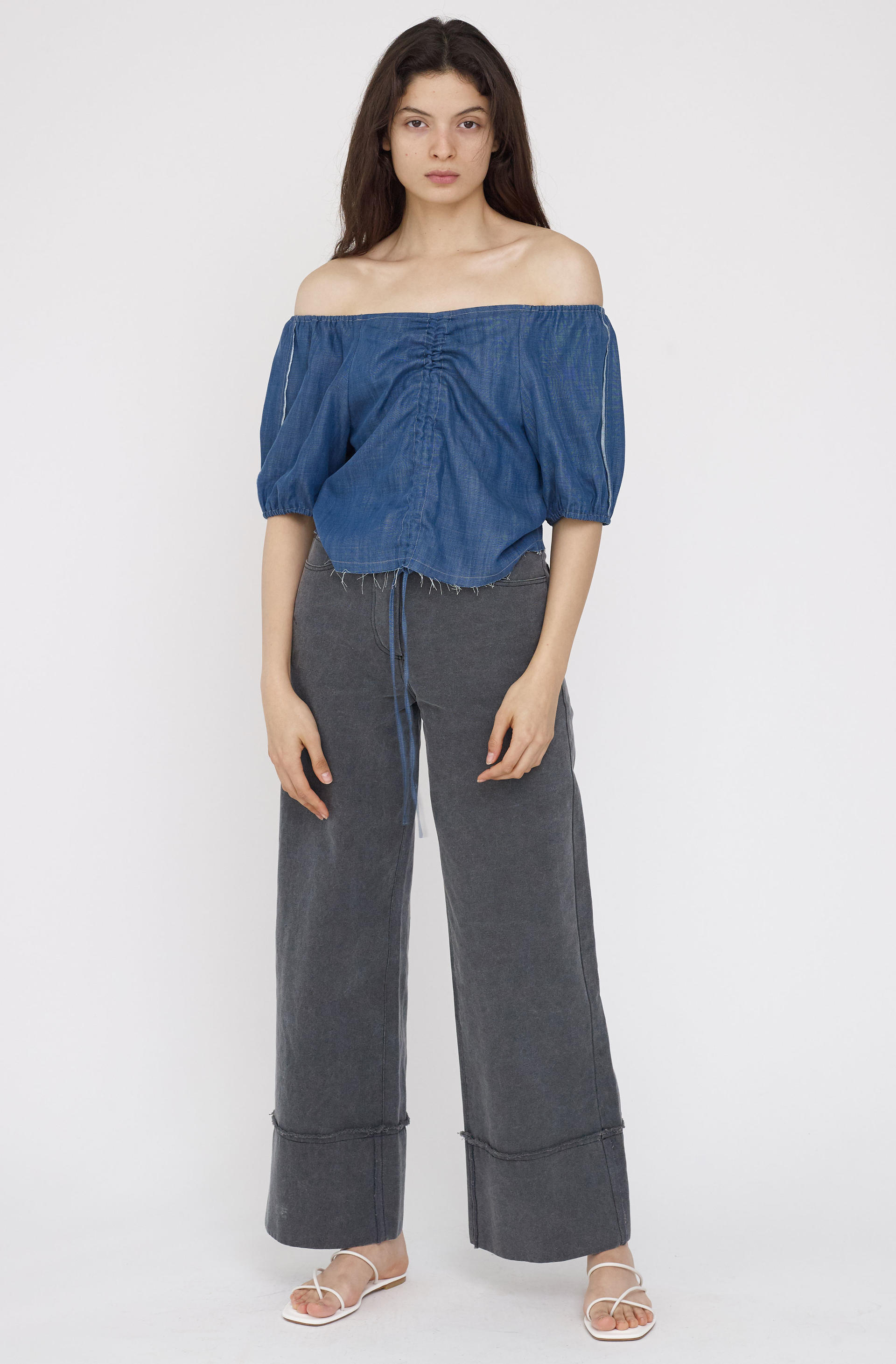 - Fabric string adjustable the amount of front line shirring